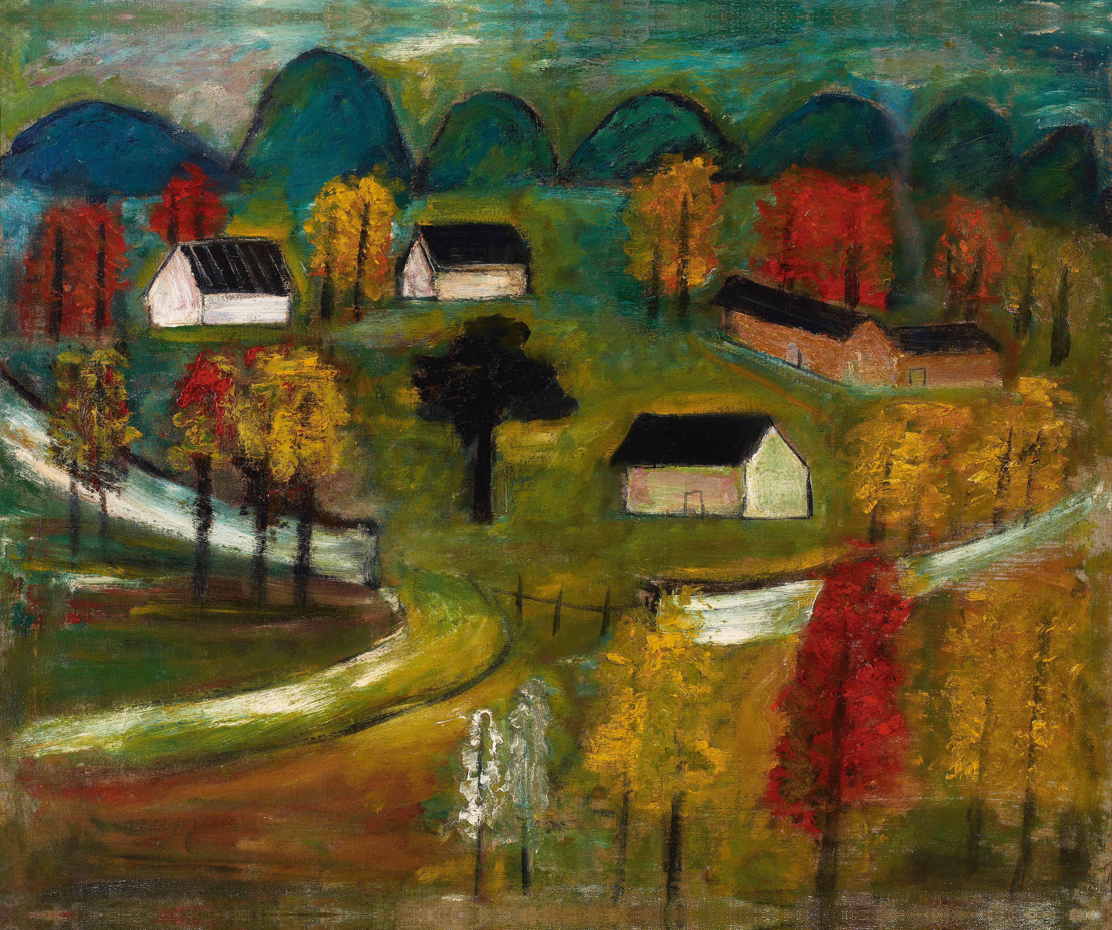 For this exhibition, Lin Fengmian’s Landscape, an oil painting done in the 1940s will be shown. His signature color painting matured over two decades of experimentation, the 1940s was a time when he explored this technique while living in Chongqing and Hangzhou as he honed the style (Lin Fengmian began to integrate ink painting into watercolor and gouache in 1947, and it was only in the 1950s, his color and ink technique was fully realized). Between the 1940s and 1950s, the oil painting components were still prominent in Lin Fengmian’s works, different from his fluid and willful color ink paintings in the later years. Although the specific time of creation is unknown, yet we can determine the work as a representative piece from this transitional period based on the medium of the painting and the details of its techniques. The composition of the painting is done in the typical Lin Fengmian’s “composition on square paper” style, in which the autumn scenery in the mountains is depicted. Even though, it is an oil painting, it has adopted many ink painting techniques, and its realm of meaning is of oriental xieyi. The distant mountain, forest, rivers, houses, all of these typical components in Lin Fengmian’s landscapes are well expressed. The green mountain range at a distance, white houses with black roofs seem especially peaceful being surrounded by gleeful rivers and a few ranges of trees, the red and yellow crown strike a cord with the green earth, the black tree shadow at the center of the image seem especially lonely and mysterious… the overall image displays an expressivity through its warm and gorgeous composition. Although certain brushworks in this painting may seem stagnant and turbid, while its execution on the details are spectacular, for instance, the rendering of the houses and the color of the sky is rich, that reveal the artist’s profound understanding on the use of colors in impressionistic paintings.
